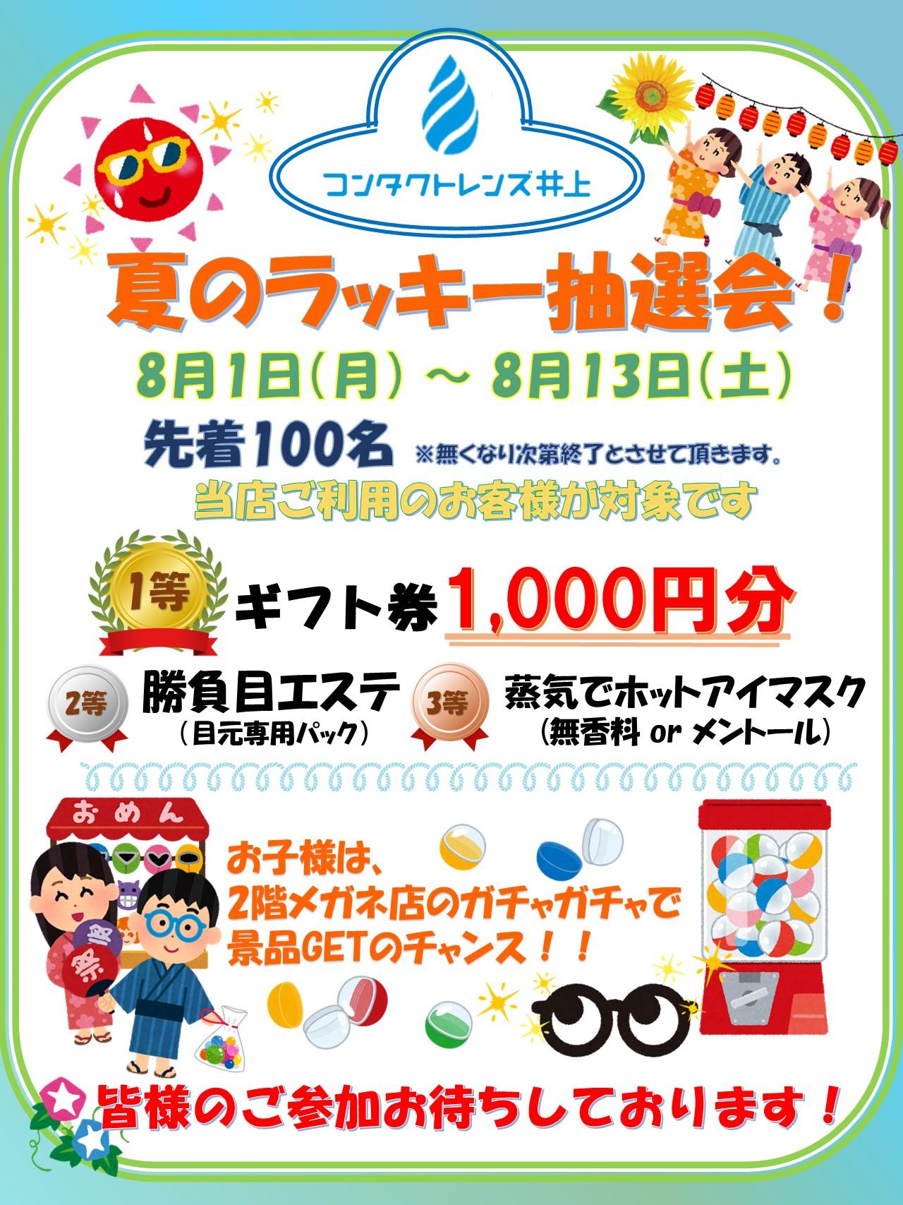 メガネの井上 ☆夏のラッキー抽選会開催!☆彡 スタッフブログ ☆夏のラッキー抽選会開催!☆彡 コンタクトレンズ井上 西葛西店 2022年08月01日管理No.10001879 シェア Tweet 《 8/1(月)~ 8/13(土)》 開催時間:10:30 ー 17:00 上記期間中に、当店でコンタクトレンズご購入のお客様全員対象★ ➤➤2階での抽選会にぜひご参加ください♪♪ *-*-*-*-*-*-*-*ー* ハズレなしの抽選となります。 お気軽にご参加ください *-*-*-*-*-*-*-*-* 前の記事へ 次の記事へ