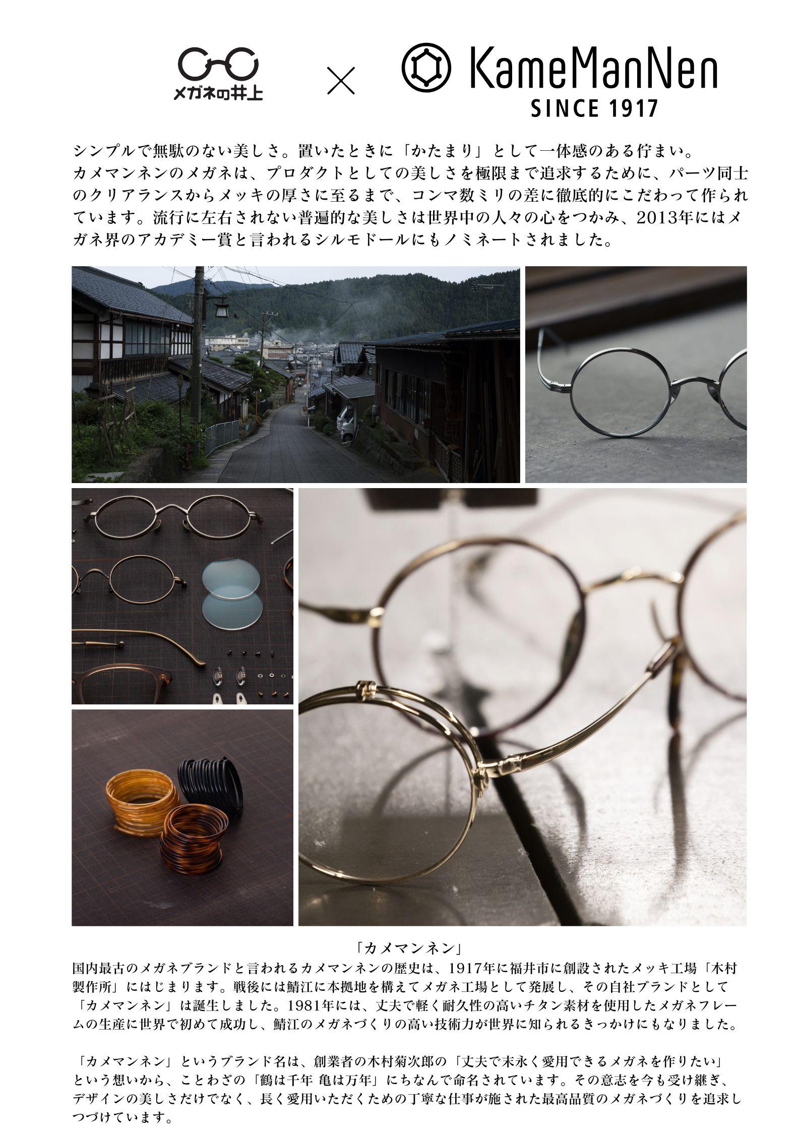 「カメマンネン」というブランド名は、創業者の木村菊次郎の「丈夫で末永く愛用できるメガネを作りたい」という想いから、ことわざの「鶴は千年 亀は万年」にちなんで命名されています。わたしたちはその意志を今も受け継ぎ、デザインの美しさだけでなく、長く愛用いただくための丁寧な仕事が施された最高品質のメガネづくりを追求しつづけています。