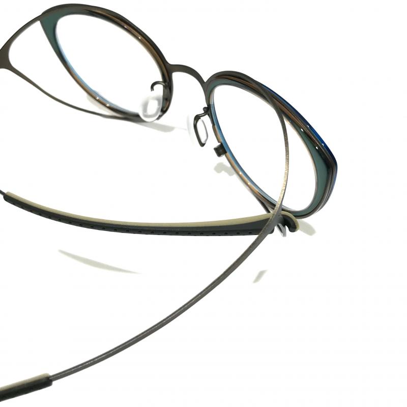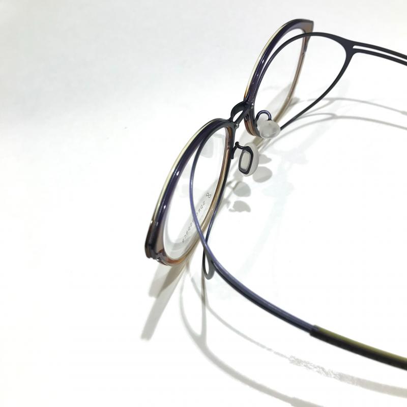 シート状のチタンにアセテートのリムをはめ込んだヒンジレスフレーム。